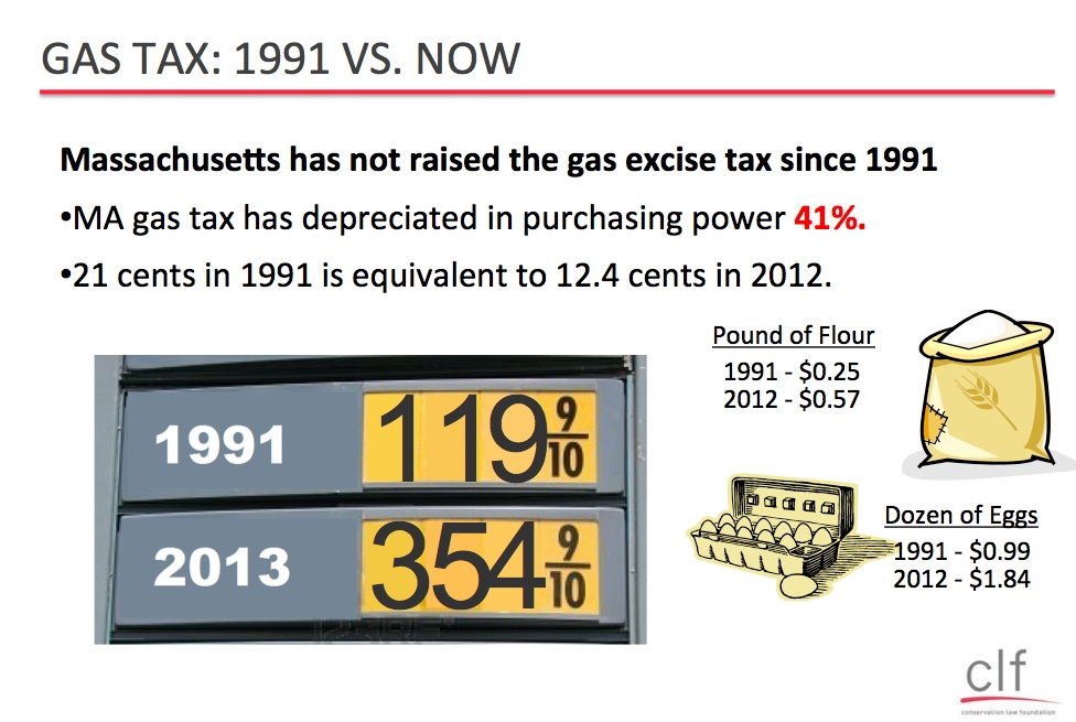 For one, the gas tax has not been increased since 1991. Due to inflation, the value of the gas tax is trickling away over time. In Massachusetts, we’ve lost 41% of the 1991 gas tax’s purchasing power as costs rise and cars become increasingly fuel-efficient. It is now worth only 12.4 cents in 1991 dollars. That’s a paltry amount, especially in light of the fact that it was originally worth 21 cents. Consider that, over the same time period, other staple consumer goods have increased in price, for example, the average cost of a pound of flour has more than doubled. It is clear that the gas tax hasn’t kept pace. Consider also that state gas taxes are higher in every other New England state, with the sole exception of New Hampshire, which is currently considering a gas tax increase whose rate would put Massachusetts in last place in our region. Nationwide, Massachusetts currently ranks 29 in the gas tax; Wyoming’s pending gas tax increase could make the Commonwealth drop to number 30 by July 1st. That should not be a point of pride.